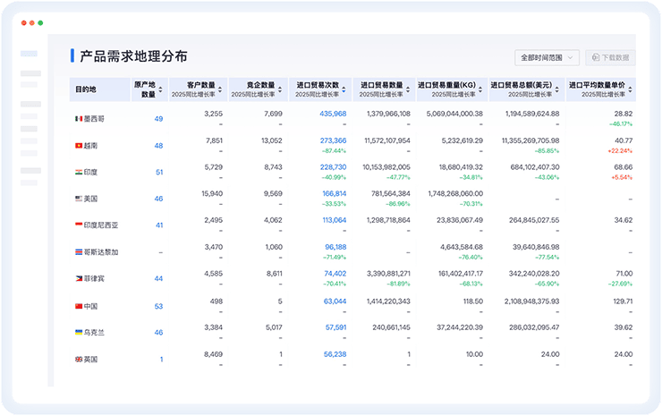 基于100亿+海量真实进出口数据,结合精准搜索功能,精准分析全球市场变化,找寻更有价值的开发市场,挖掘新的产品开发方向,帮助企业定位增长方向。