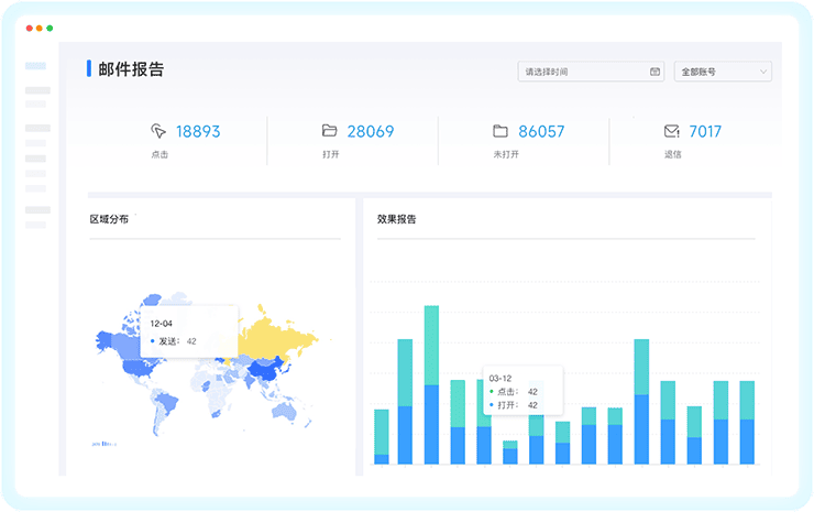 行业独有,海外服务器+动态IP地址,90%高抵达率,内置多种国际化邮件营销模板,支持查看与分析打开率、点击率等数据,助力营销策略优化。
